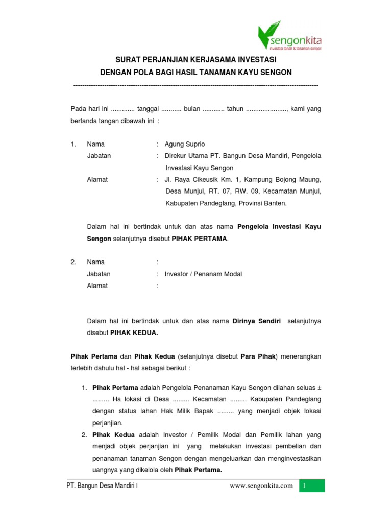 Contoh surat perjanjian kerjasama investasi modal usaha ini digunakan sebagai keterangan dan pengikat dua belah pihak yang melakukan kerjasama. Surat perjanjian kerjasama investasi pada hari ini tanggal tujuh bulan juni tahun dua ribu dua belas 07062017 yang bertanda tangan di bawah ini. Dalam sebuah kesepakatan baik itu dilakukan antar perorangan atau perusahaan, adanya perjanjian dalam bentuk tertulis adalah hal yang utama.
