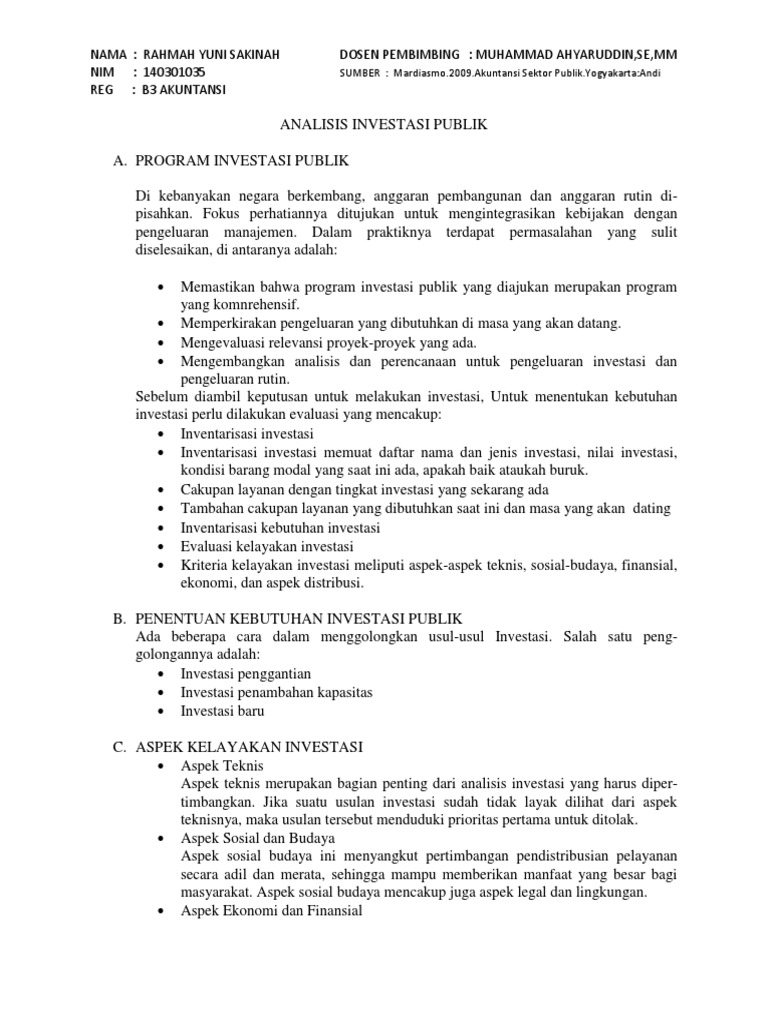 Investasi yang terjadi di daerah terdiri dari investasi pemerintah dan investasi swasta. Makalah wakaf sebagai instrumen investasi publik disusun dan diajukan guna memenuhi tugas mata kuliah bahasa indonesia dosen pengampu: Analisa investasi berhubungan erat dengan penganggaran fungsional, alokasi sumberdaya dan praktek manajemen keuangan di sektor publik.