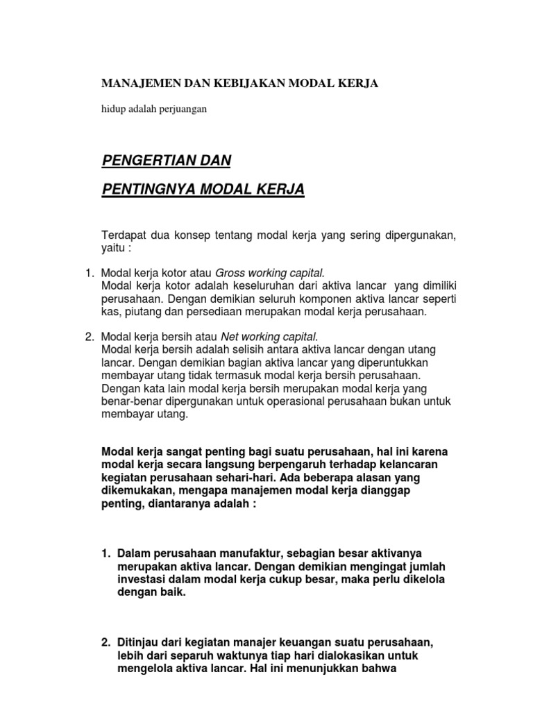 Modal kerja pengelolaan modal kerja terkait dengan keputusan investasi dan pembelanjaan jangka pendek yang tercermin pada aset lancar dan utang lancar perusahaan. Terbuka untuk penanaman modal, peraturan tenaga kerja asing, peraturan tata cara penanaman modal, perizinan, ptsp, dan beberapa peraturan pelaksana. Demikianlah penjelasan singkat mengenai working capital management , semoga bisa menambah informasi dan pengetahuan untuk anda semua.