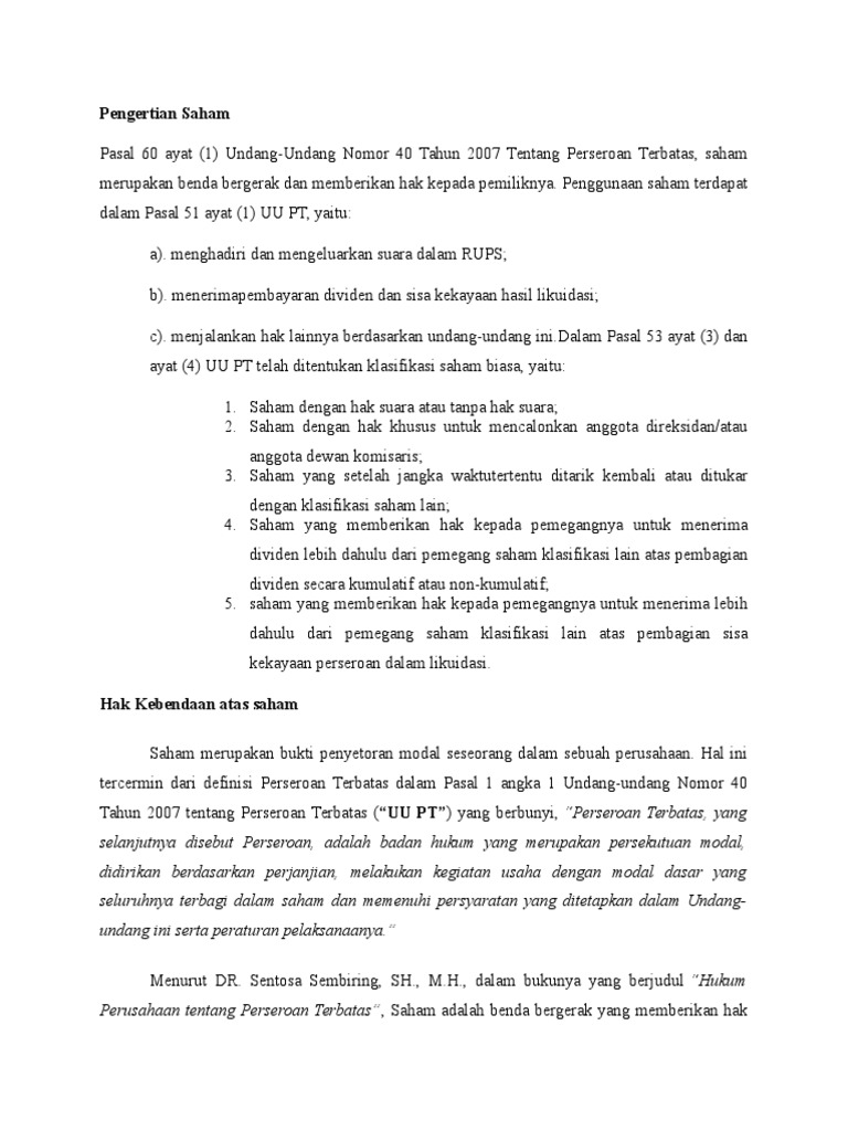 Pengertian saham adalah dokumen berharga yang menunjukkan bagian kepemilikan atas suatu perusahaan. Hal ini bertujuan agar imbal hasil atau keuntungan (return) yang diperoleh di masa depan bisa terakumulasi secara masif. Menurut istijanto oei (2009:13) 6.
